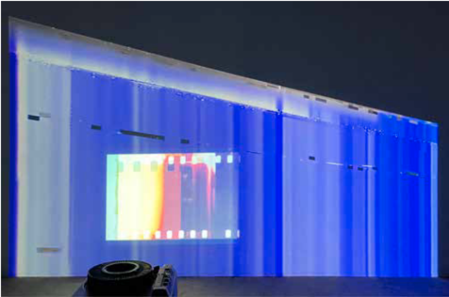 "Fulgúreo (End Film)" es una instalación que reflexiona sobre la imagen y el tiempo en diferentes escalas espaciotemporales. El vídeo digital proviene de una recopilación de todas las imágenes generadas y enviadas por la sonda espacial Cassini, de la misión internacional Cassini-Huygens (1997-2017). Selecciono solamente las últimas imágenes enviadas, que no son más que glitches, cuando la sonda espacial se dirigía a su completa desintegración en la atmósfera de Saturno en septiembre de 2017. Por otro lado, las diapositivas que se proyectan por encima de esta proyección son terminaciones de películas, conocidas como end films, en las que no hay ninguna imagen, simplemente el rastro de los químicos del revelado. Ambos conjuntos de imágenes muestran diferentes escalas temporales –más prosaica e íntima en el caso de las diapositivas; más técnica o científica y de mayor relevancia que fotografías personales en el caso de las imágenes de la sonda espacial– y hablan de un tiempo (pasado, que es presente y futuro) a través de una imagen ’final’, descompuesta, fantasmagórica. La obra propone una reflexión sobre las imágenes y nuestra relación con la realidad, cómo el conocimiento científico (micro y macro) pasa por la visualización de imágenes y cómo nosotros tenemos la necesidad de registrar, dejar un rastro imagético, de nuestra existencia (antes con medios analógicos que involucraban procesos químicos, a día de hoy de forma digital).