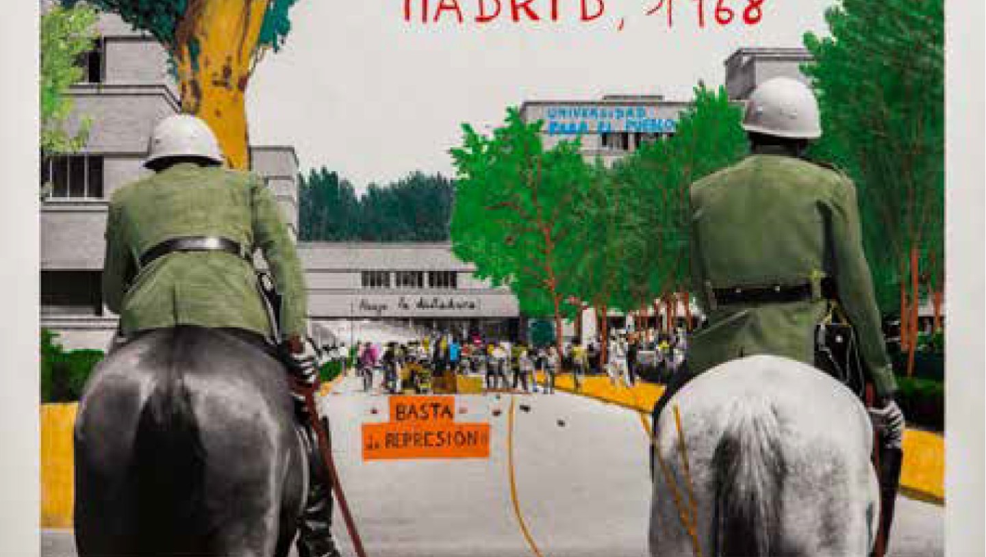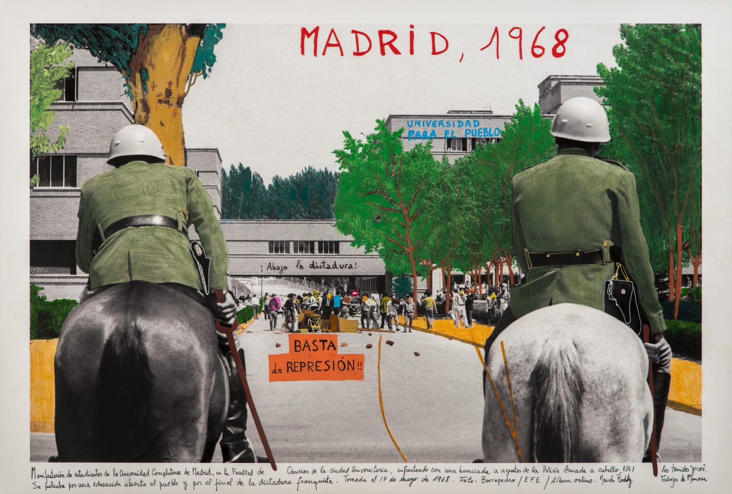 "Me ha costado mucho encontrar imágenes de la resistencia al Franquismo cuando el dictador estaba con vida. La sensación general parece ser que Franco murió en la cama, y no hay muchas situaciones de resistencia que pervivan en la memoria colectiva, más allá del maquis posterior a la Guerra Civil. Me he propuesto investigar y encontrar imágenes de la resistencia al Franquismo en los años sesenta y setenta. He encontrado algunas en la agencia EFE, en la Fundación Primero de Mayo de Comisiones Obreras, y en el Archivo iconográfico de la Universidad Complutense de Madrid. Hay un rasgo común a la mayoría de estas imágenes, excepto la del recital de Raimon en la Complutense: no se ven los rostros de los manifestantes. Hay miedo. Se ocultan los rostros frente a los caballos con cuadernos y prendas de abrigo, se tapan los ojos de los exiliados españoles en Utrecht para evitar que se los reconozca (así estaban en el archivo), las tomas de las marchas relámpago muestran a los manifestantes de espaldas… Las imágenes de 1968 muestran a los jóvenes de frente en las calles del mundo. En España los jóvenes salían a las calles, pero se tapaban la cara."